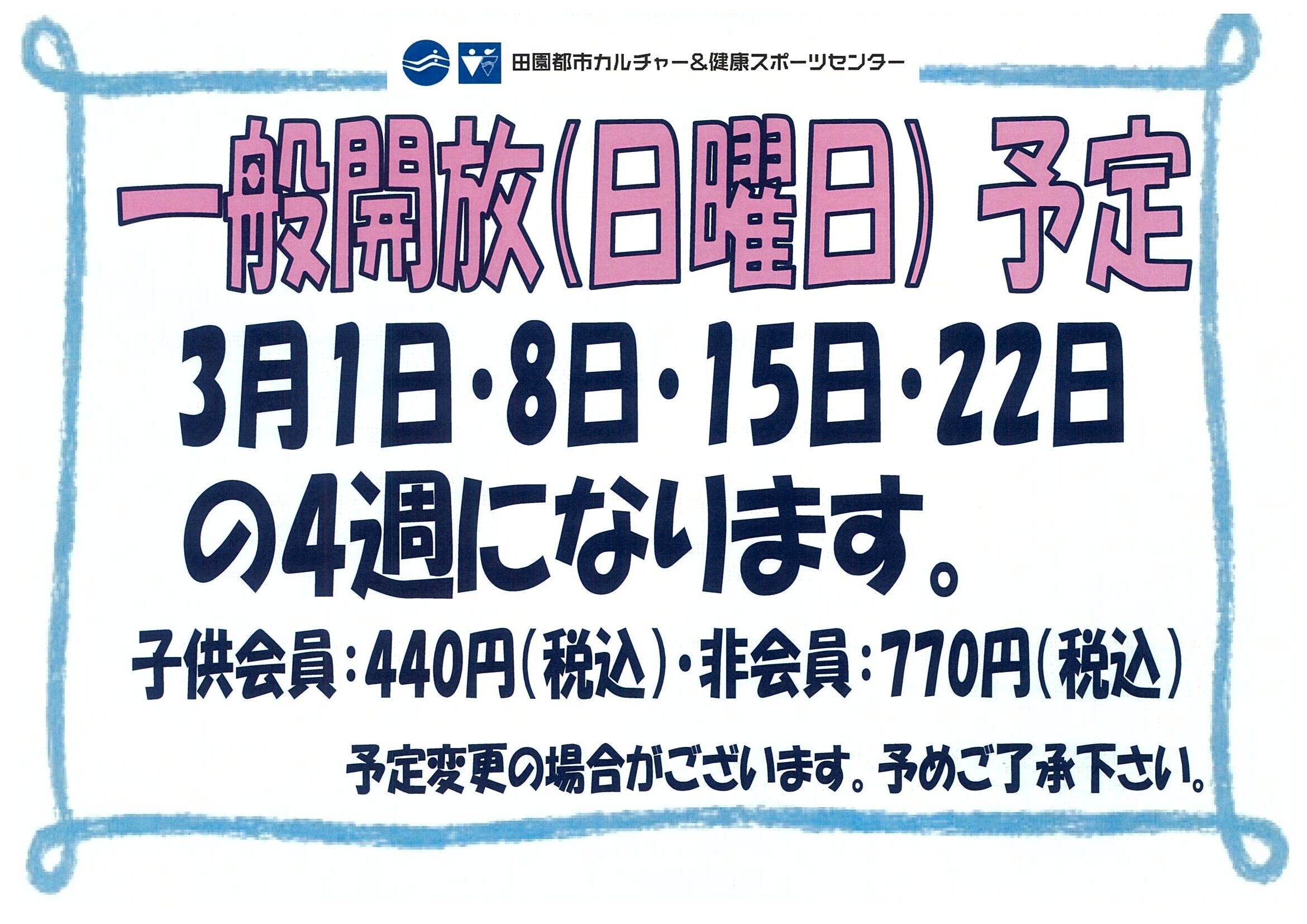 日曜日(不定期)の11:15~13:00迄、非会員の皆様にも温水プールをご利用頂けることになりました。